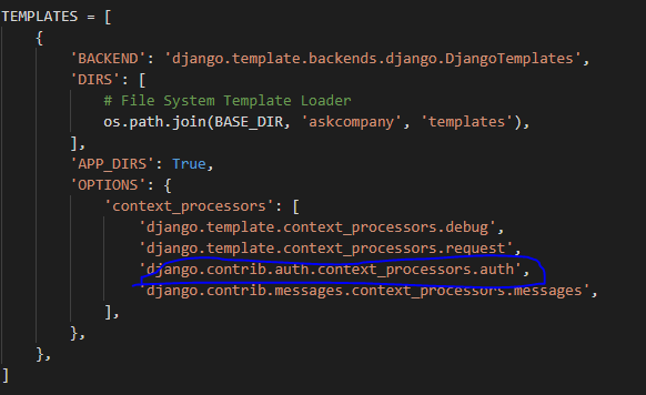 settings.py에서 Template 안에서 사용할 Context 사전의 목록들을 만들어주는 함수들이 선언되어 있는대, 그 중 auth를 통해서 {{ user }} 객체를 받을 수 있다. 아래에 'perms'의 값 찍어본 내용도 존재한다.