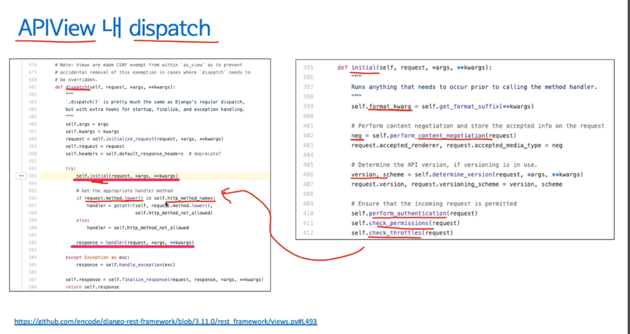 그런데 API View를 상속받아 사용하면 멤버함수 호출하기 전에 APIView 내 dispatch에.initial() 단계에서 위에 1~5 순서대로 먼저 처리를 하게 된다.