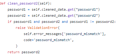 clean_password2() 메서드에서 2개의 password가 동일하면 OK, 다르면 ValidationError를 발생시켜 입력받은 2개의 password가 동일한지 검증을 한다.