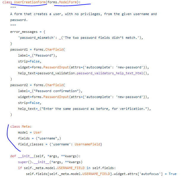 UserCreationForm에서는 User 모델에서 "username" field를 하나만 가져온다.