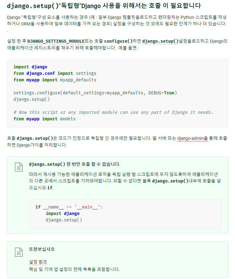 django.setup() 명령어로 django 환경을 load하면 Django 프로젝트의 구성요소들을 외부 스크립트에서 load하여 사용할 수 있다.