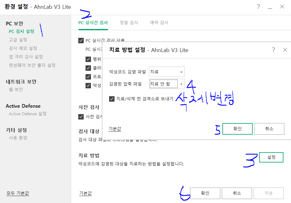 순서1. 아래 첨부된 이미지 따라하여 치료방법 설정에서 감염된 압축 파일 설정이 '치료 안 함' 으로 되어 있던 걸 '삭제'로 설정 변경한다.