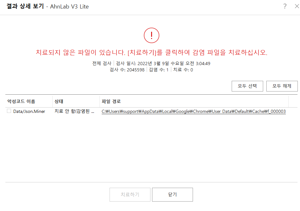 V3로 검사 실행 후 감염된 파일 발견하였으나 치료하기 위하여 감염된 파일 선택이 안 됨.