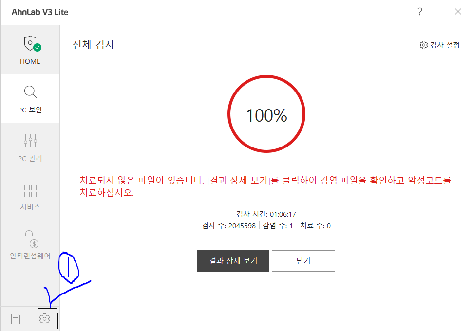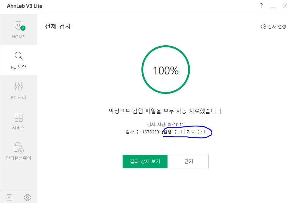 순서2. 재검사를 진행하면 이전과 달리 감염된 파일 삭제가 가능해진다.