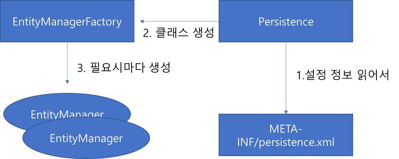 // DB 커넥션을 얻어서 쿼리를 날리고 종료되는 그런 일관적인 단위를 수행할때 마다 EntityManager 를 꼭 만들어 주어야 한다.