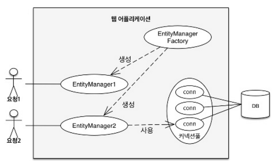 // 엔티티 매니저는 쓰레드간에 공유 X ( 매번 요청시마다 새로 생성하고, 쓰고 나면 바로 버려야 한다.)