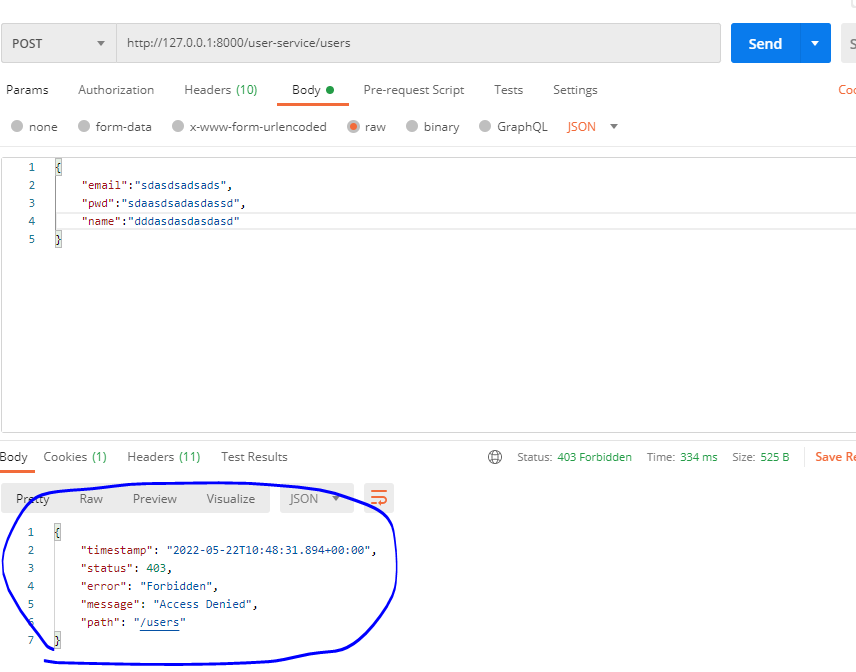 (POST / 127.0.0.1:8000/user-service/user API 호출 시 아래처럼 403 에러 발생)