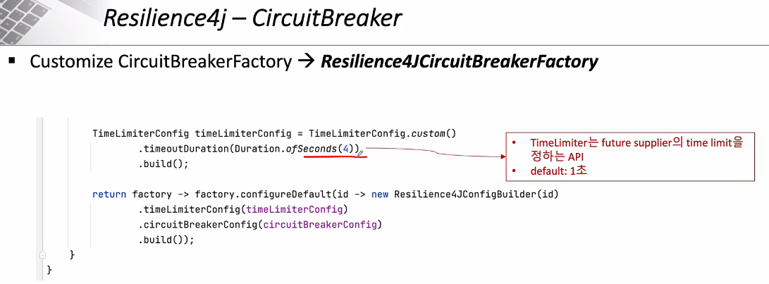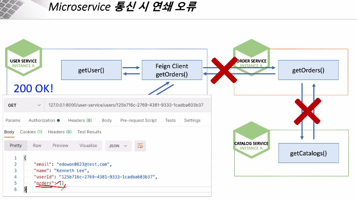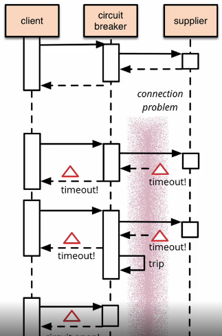 어떤 서비스의 경우는 다른 서비스 호출 값을 꼭 클라이언트에 전달 안해도 되거나 하는 경우는 서비스가 호출하는 다른 서버와 연결이 지속적으로 안 되는 경우 Circuit Breaker 기능을 적용하여 그 서버를 설정한 시간동안 호출을 안 하도록 설정이 가능하다.