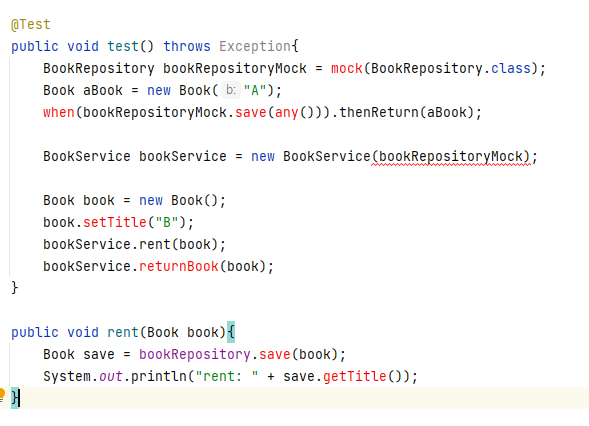 bookService.rent(book) 에서 "B" book을 전달하였음에도, A가 찍히게 된다