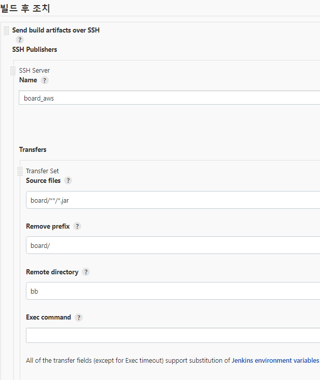 젠킨스 서버에서 배포 할 배포서버 주소와 빌드 결과 파일 배포 될 디렉터리 경로 지정하는 부분