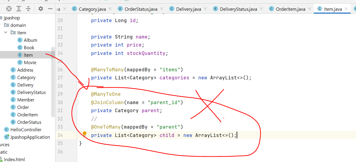 에러 원인 : 뭐에 홀렸는지 모르겠지만, 강의 보며 아래 연관매핑 코드를 ITEM 추상 클래스에 집어넣어서 그런거였음