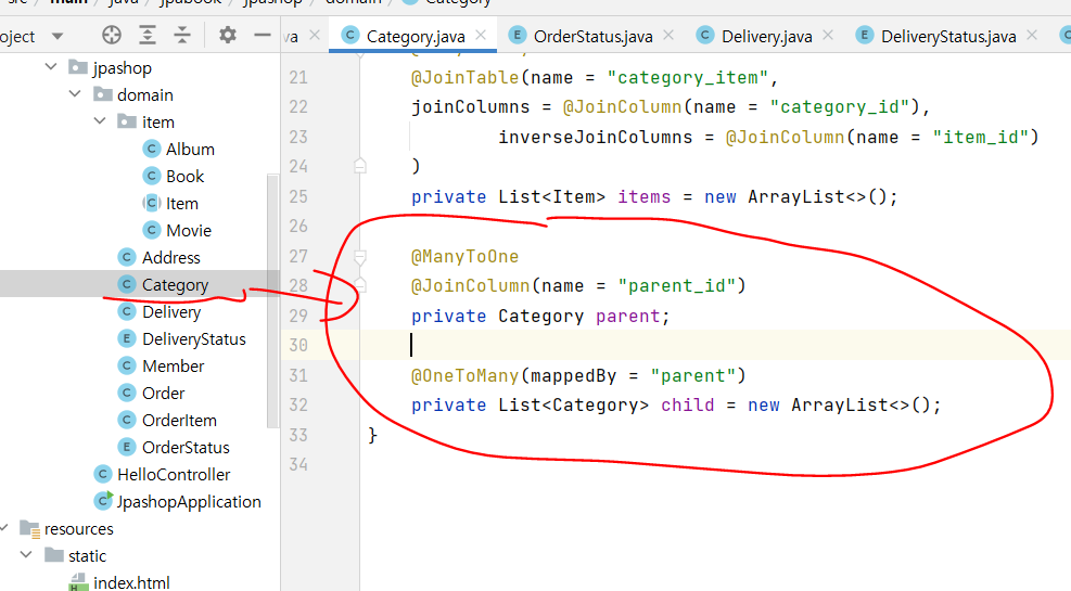 에러 해결 : Item 클래스 하위에 잘못 작성한 것 삭제하고, Category로 옮기니 해결