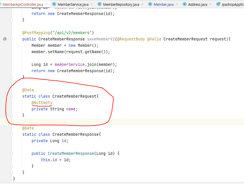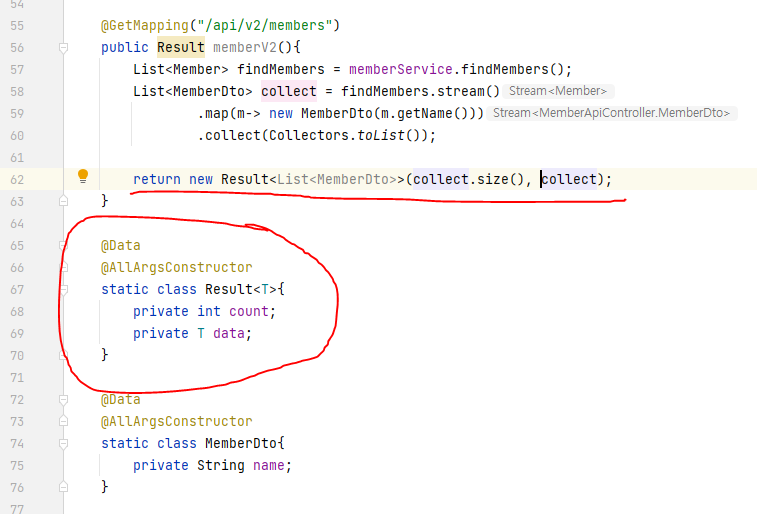 ※ 주의사항 : DTO 클래스 안에 멤버변수로 Entity가 있으면 안 되고, DTO 만 포함해야 한다.