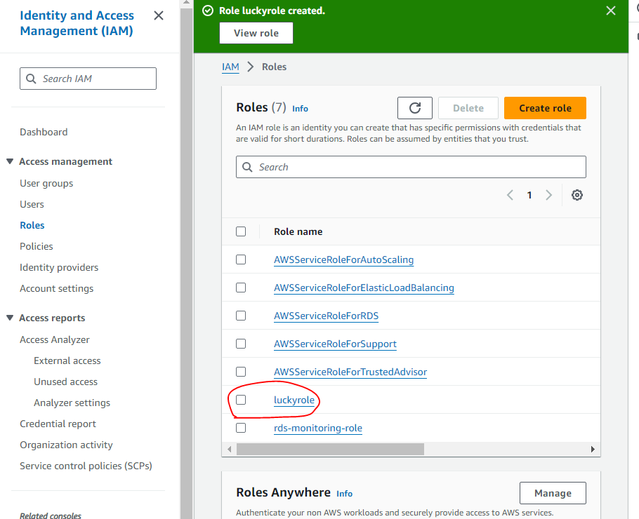 위에 ec2에서 S3 fullAccess 권한 주는 luckyrole이 만들어진것 확인 가능하다.
