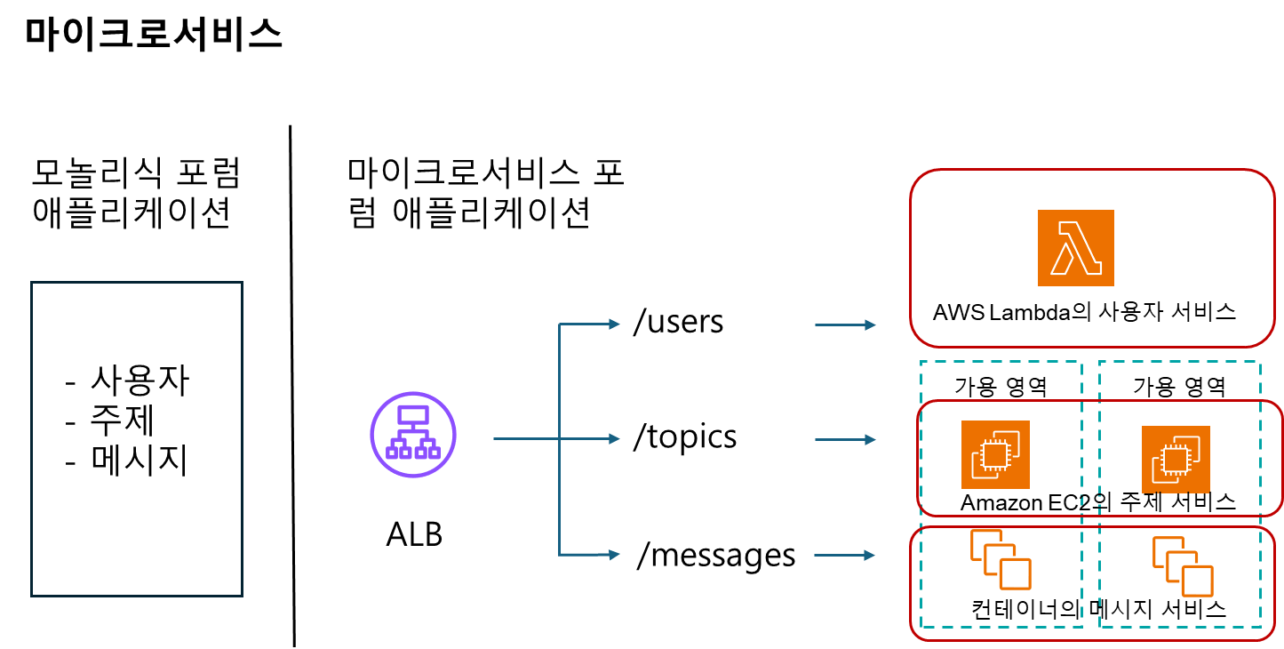 위의 이미지에서 모놀리식 포럼 애플리케이션을 사용자 서비스, 주제 서비스, 메시지 서비스와 같은 마이크로서비스 아키텍처를 사용하도록 리팩터링한다.