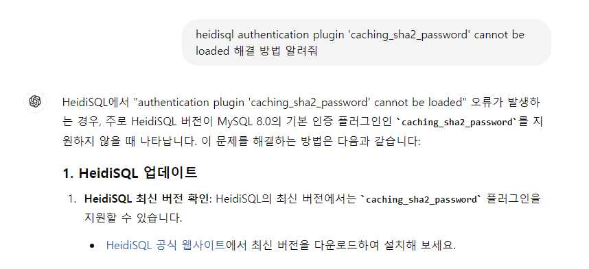 에러 문구 : heidisql authentication plugin 'caching_sha2_password' cannot be loaded