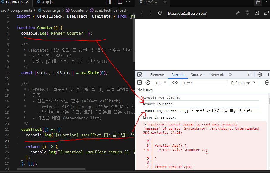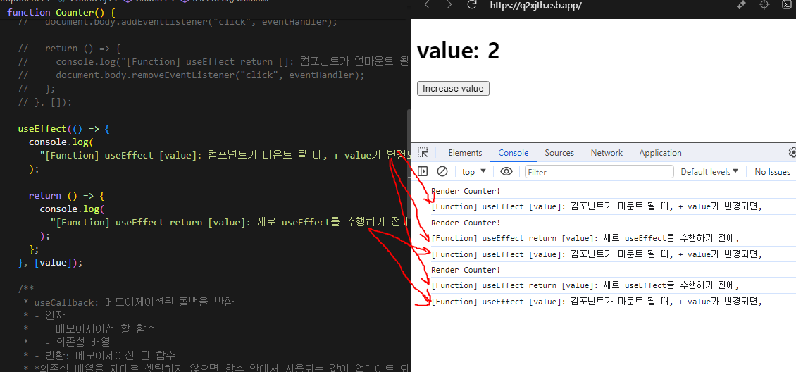 이때 CleanUp 함수는 Value 스테이트가 변경되어서 리렌더링 될 때, useEffect() 도 한 번 더 실행이 될 텐데, 실제적으로 안에 있는 함수가 실행되기 직전에 이 CleanUp 함수를 실행하고 그 다음에 useEffect() 안에 있는 함수를 실행한다.