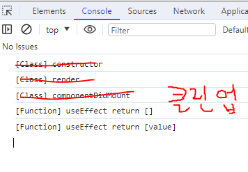 아래 이미지에서 state의 변화에 따라 useEffect 함수 내에서 로직 실행되는 순서 콘솔창에서 확인이 가능하다.