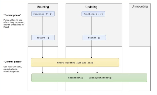 이런 식으로 React의 컴포넌트는 처음 실행된 건지, 상태 변화에 의해 다시 실행된 건지, 또는 어떤 상태가 변했는지에 의해서 그 동작 방식이 조금씩 달라질 수 있다.