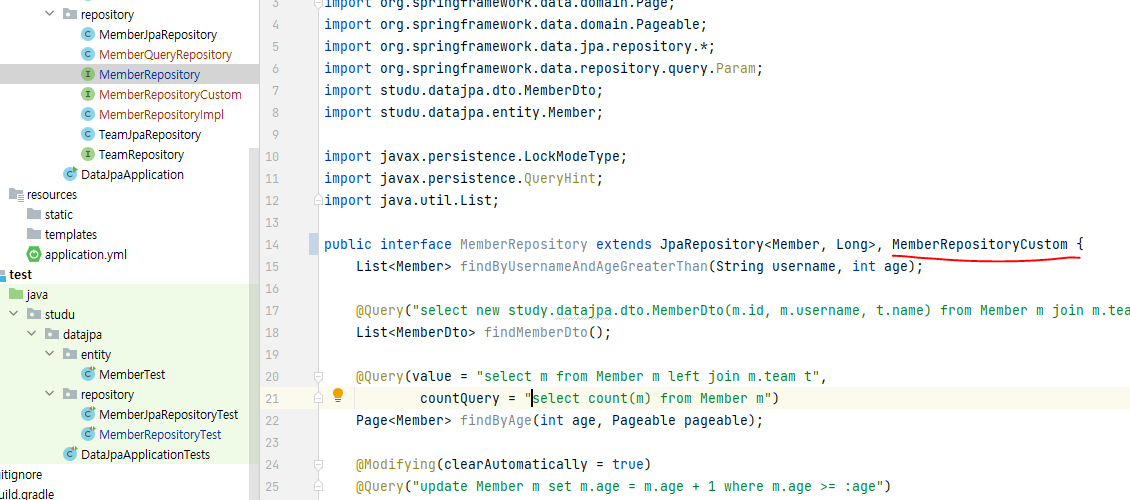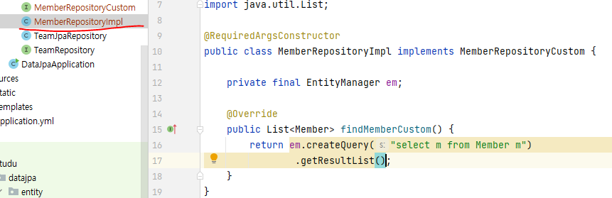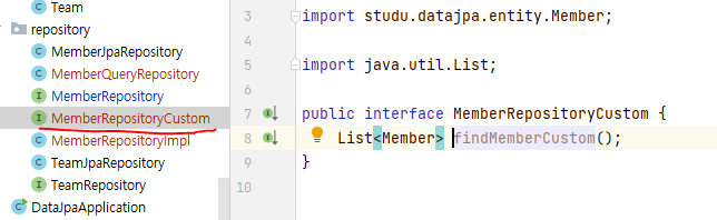 아래처럼 쓰면 spring data jpa가 구현체 알아서 찾아서 묶어준다고 한다. (단 구현 클래스 네이밍 규칙 등 맞춰야 함)